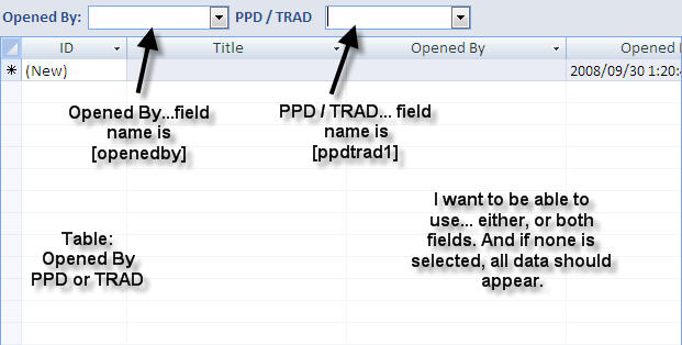 I have a blank. Its been a while that I have played with queries. I created a simple query that would filter out from 2 different fields on a form. The only thing is that I can use either one or the other field. If I use both, the query doesnt work porperly. ... see code