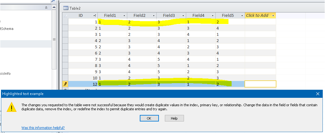 Trying to duplicate record 1 in record 12 has been correctly prevented using a composite PK field