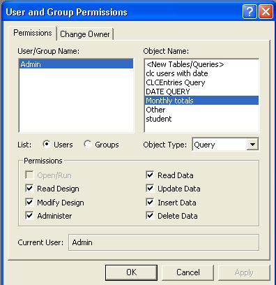 I can open the database in Access 97. In the "User and Group Permissions" dialog box there are two groups ("Admins" and "Users") and one user ("Admin").