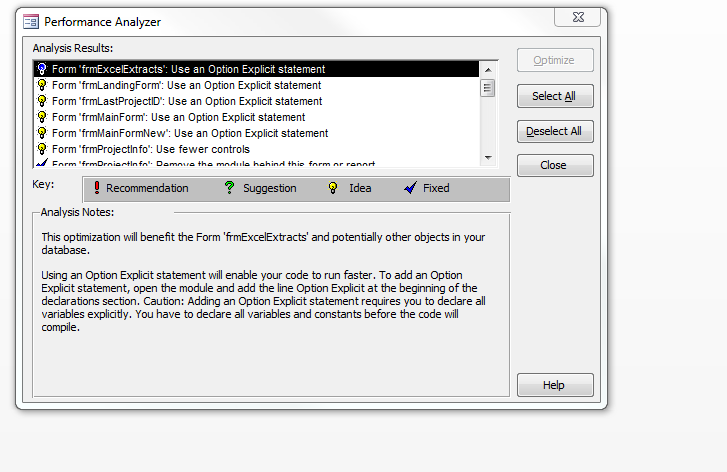 I am just finishing up with my db and I ran the performance analyzer. There were no errors with tables or queries but there is a whole bunch of 'idea' from access on my forms. I am not sure if its worth the time to go through each.