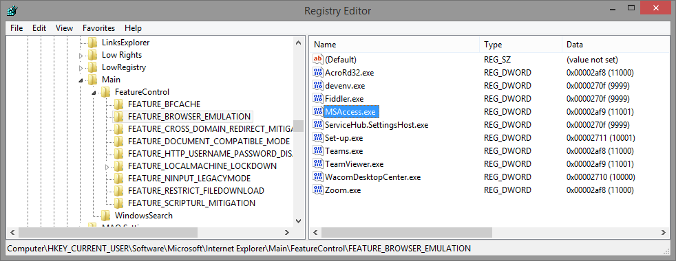 By the way, I updated the previous post to correct an important detail: the necessary registry key is located under HKEY_CURRENT_USER, not HKEY_LOCAL_MACHINE. The full path where the MSAccess.exe key with the value 11001 needs to be added is: