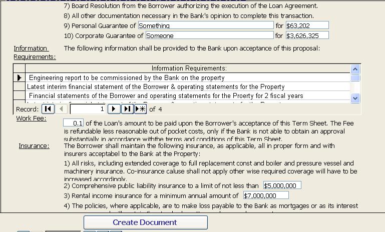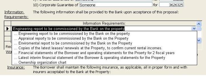 Same as last night it is not 12:25 and I am going to bed, Just a thought re those conditions in the subform. The all look like one liners so why not have them in a combo box in a table called tblConditons and link them to the subform and to the main form in a Many to Many relationship. That way a loan agreement could have many conditions per agreement BUT only 1 of each. The prevents you have having 2