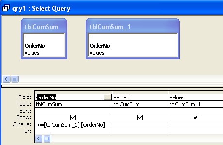 You may be wondering just what tblCumSum_1 is. I added the table to the query twice and joined them using the criteria tblCumSum.OrderNo >= tblCumSum_1.OrderNo. (If you add a table to a query more than once, Access automatically places an _1 to the end of the original name.)