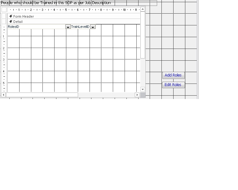 All this has been working fine for months, almost a year. Each selection on the subform is based on using two combo boxes [Role] & [TrainingLevel] these are both setup on the subform and using the autonumber field, RolesID and TraininglevelID from two separate tables.