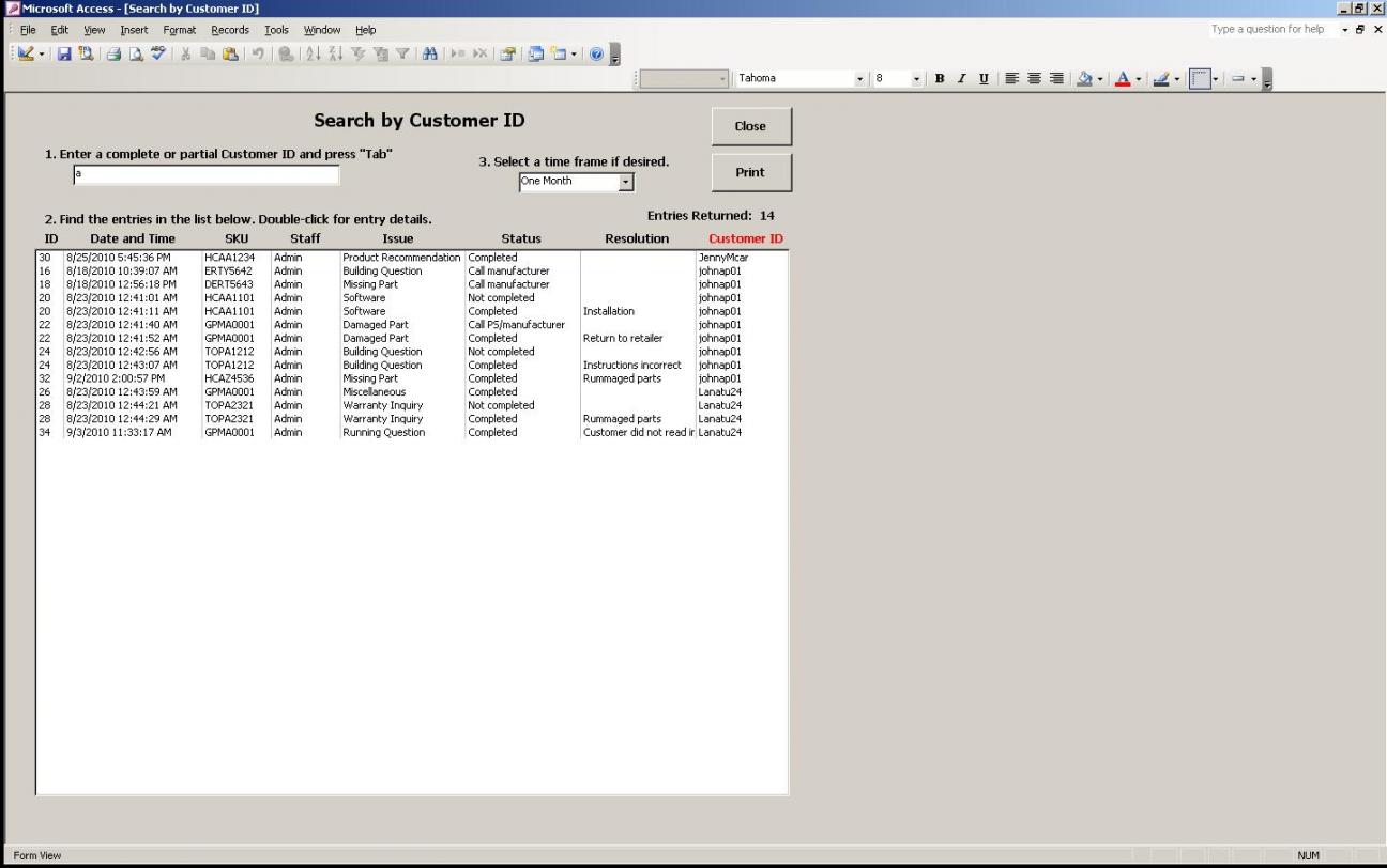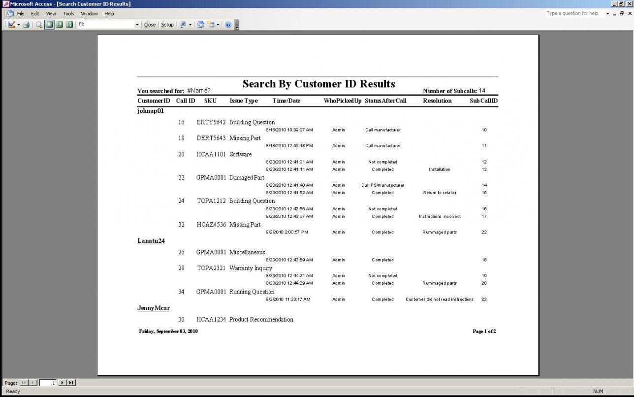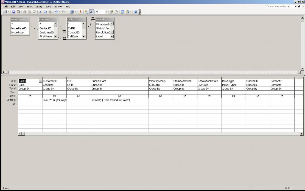 -When I click on "print", another query is opened, shown in image "query". This query gets part of its criteria from box 1 in the form, but because I did not know how to "grab" the text "One Month" (One Week, Two weeks,...) and turn it into a number value to use in the "SubcallDate" field in the query, I resorted to simply having the query ask for the value "Time Period in Days" in a dialog box. The user the re-enters a time period in days that the query uses to return results.
