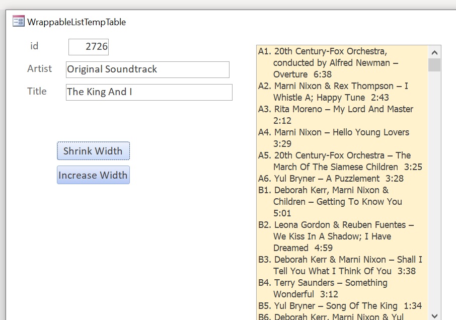 Not trying to be a jerk, but trying to give some tough-love. it seems you are trying to outsmart everyone who has ever built a proper Access application. By making it less "complicated" you have come up with some very complicated way of doing things. I have made thousands and helped people with thousands of Access databases, but I cannot make heads or tails of what you are trying to do. I think what you want to do is a trivial application, and you are wasting a ton of time trying to come up with completely new ways to do things.My db is not relational. Everything is in one table so I've no need for P or F keys, and their complications. One table is so easy to update and maintain. You asked How are you relating tracks to albums. There's no relationship, the tarcks *are* the album.