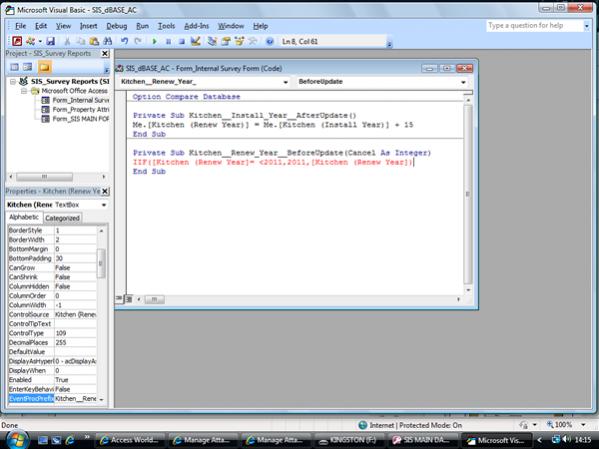Now with the code; whilst your form is in design view, click in the the After Update event row for Kitchen Install year, select Event Procedure from the list. Now click on the button with the three full stops on it (ellipsis). A new code window will open up which will look something like;