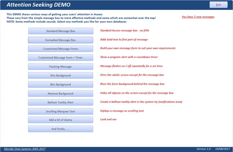 A recent thread https://www.access-programmers.co.uk/forums/showthread.php?t=295318 prompted me to compile a demo database showing many of the ways of getting users' attention.