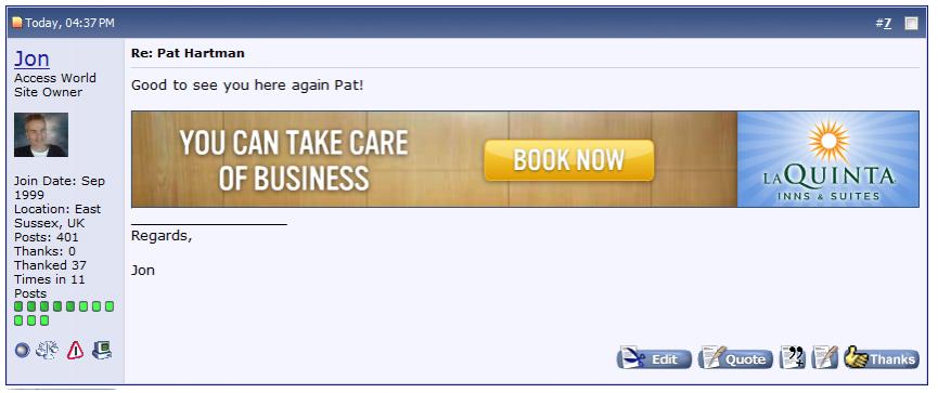 An example of a goodad and badad are attached. Another forum I visit has ads between posts, so they don't find themselves in the middle of a post above the signature but below the actual words left by the member. Your post attached shows an ad right in the middle of your post, even appearing before your signature. This is a bit much and honestly a bit of an eyesore. This could have ramifications on member participation, especially on smaller browsers.