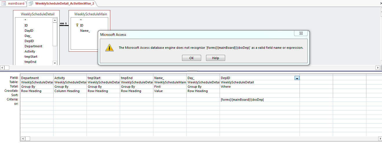R rehanemis Registered User. Local time Today, 20:32 Joined Apr 7, 2014 Messages 195 Oct 26, 2015 #1 Hi, I have simple cross tab query (as shown in the attached snap shot). I just want to get result when I chooses the DepID from MainBoard. I am getting error message. Any idea how to resolve the issue. Thanks in advance. Attachments ProblemQuery.PNG 48 KB · Views: 131
