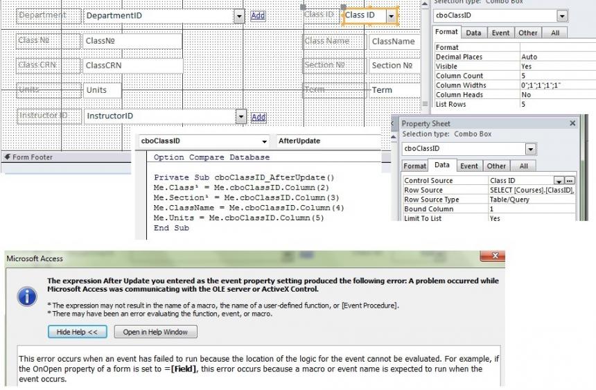 I have a form on which I want to fill 4 fields from a combo box. Not sure what I am doing wrong but attached a graphic with what I think is needed to answer the error message.
