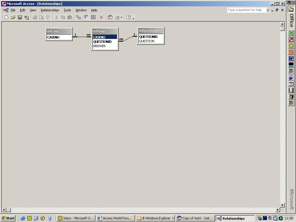 there are 20 questions in tblQuestion, i want the user to open a form, enter the caseno, click a button and a subform (control source = tblMain) will poulate with the 20 questions. then my users can add their answers.