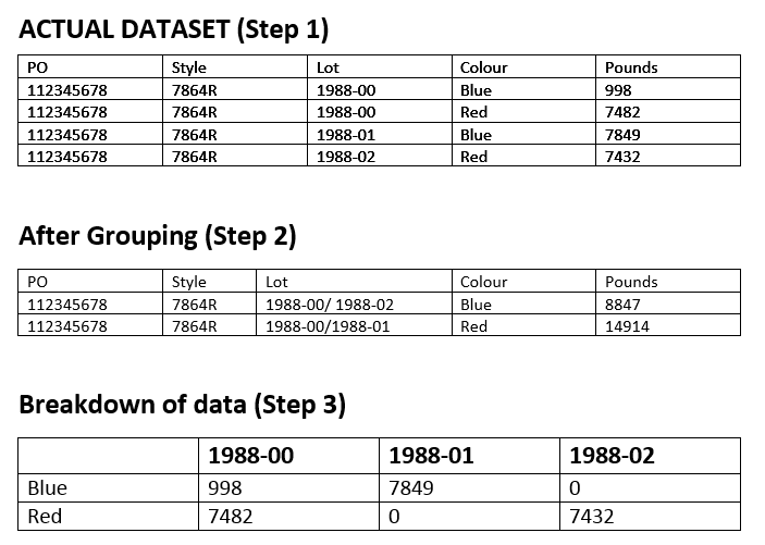 C CJ_London Super Moderator Staff member Local time Today, 04:53 Joined Feb 19, 2013 Messages 17,763 Feb 21, 2018 #2 use a crosstab query (which will also do your grouping, so work from your original data) use colour for row heading, lot for column heading and pounds for value (as a sum)