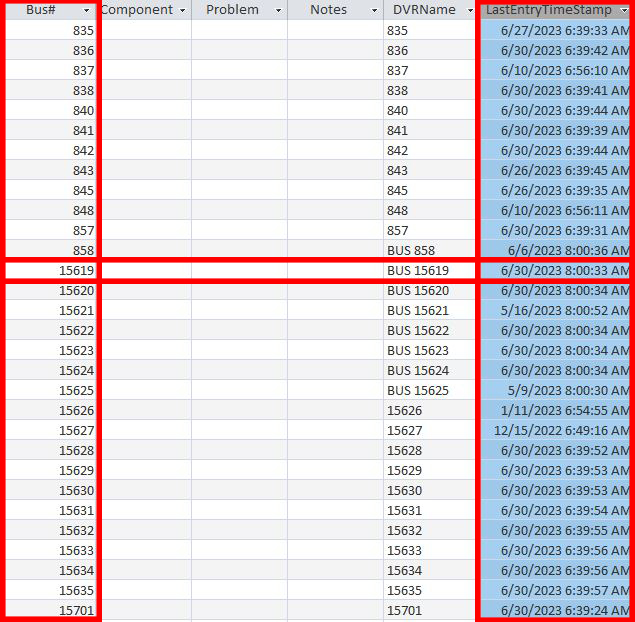 There is a field in the (CamInputToMaintT Form) Form for "LastEntryTimeStamp" <date/time entry> which needs to be populated from data in a specific query [CameraHealthCheck ALLCompiled RepairDue Query2] which is based on the "Bus#" field that is entered.