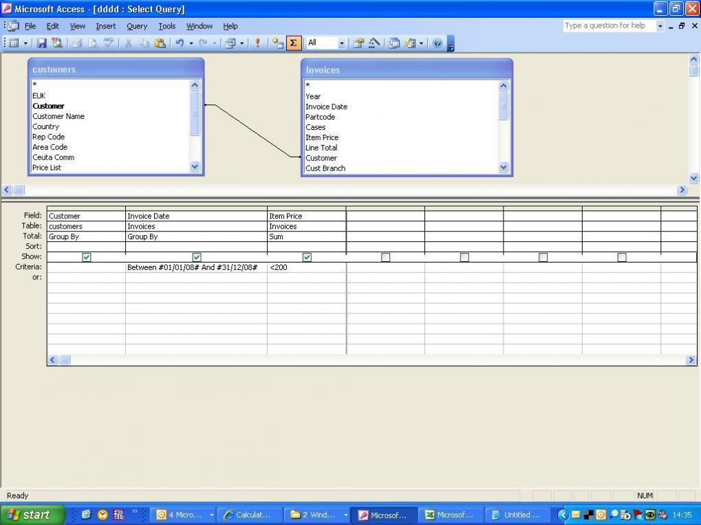 I'm trying to do a query in access to show any customers that have spent £200 or less in total during 2008. We have an access database