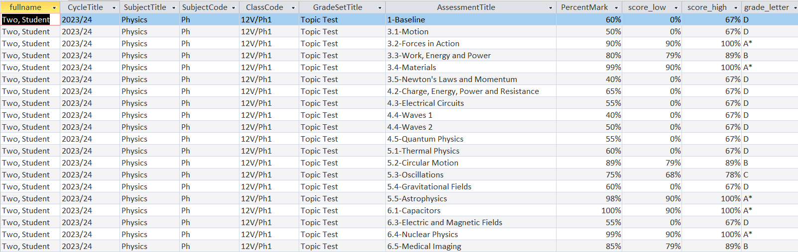 Module tests and trial exams (graded on a A*-U) scale. Different boundaries depending on the test. The grade boundaries for these tests can change from one year to the next but the title of the assessment topic will remain the same. I'd need to be able to input and see the current cohort but also be able to look at previous cohorts.