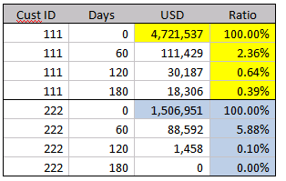 The problem im having is how to make the ratio formula (as there are multiple customers – in below yellow ratio should be calculated on cust ID 111 and blue should be the same formula but calculated on cust ID 222).