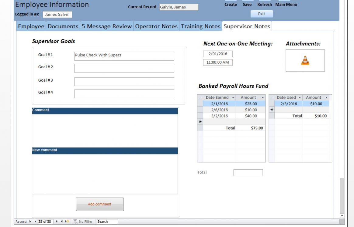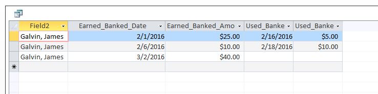 I have entered data for myself, which shows up 3 times as I've earned money on 3 separate dates. I want to take the total earned money and subtract the total Used amount from it and get a total of what is left, and I'd like to do this by Employee. There is only one employee in there now, but eventually there will be more.