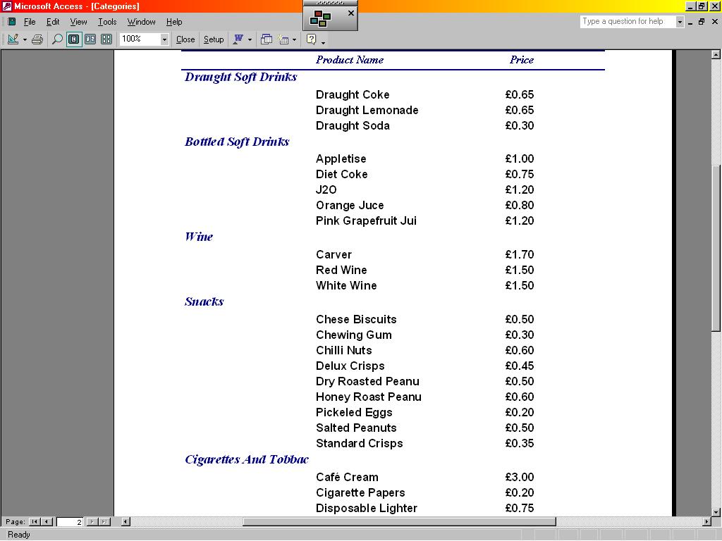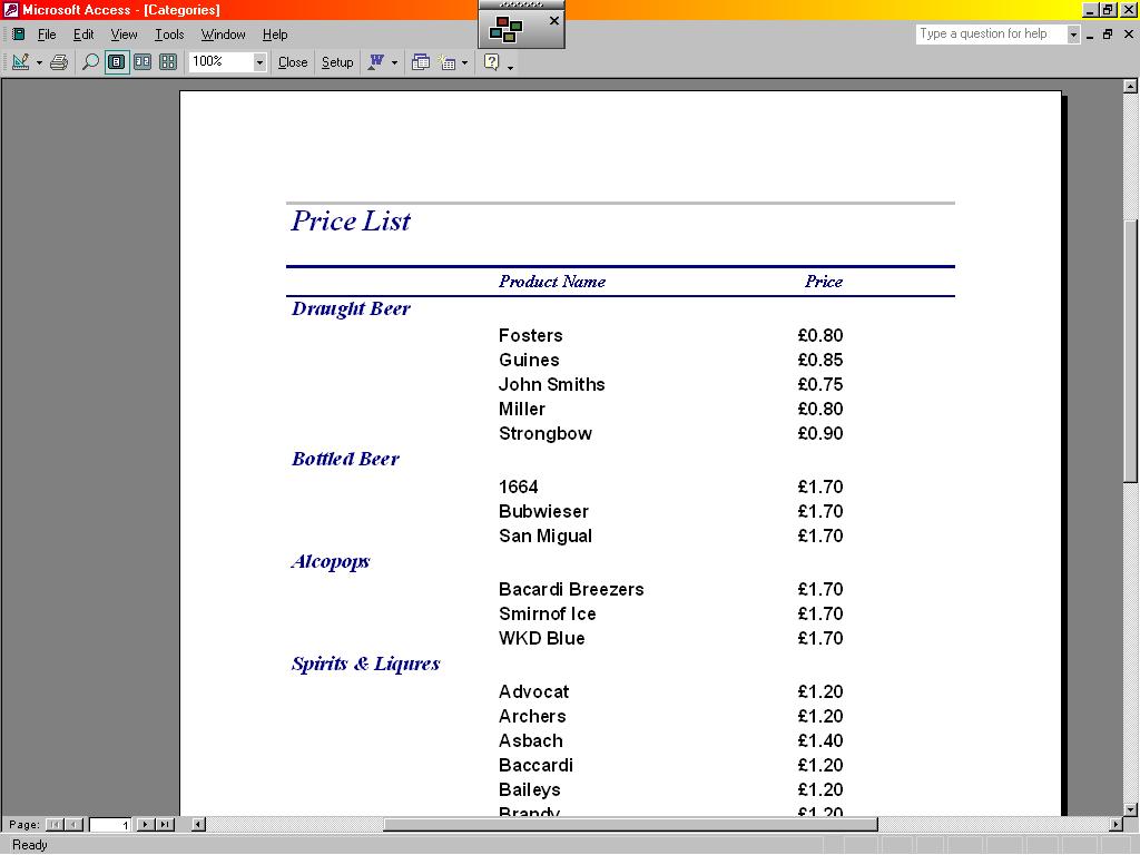 I am building a db for the club my wife runs. As part of the db I have to account for inventory movement of bar stock and she would also like this to be able to produce the legal price list for display.