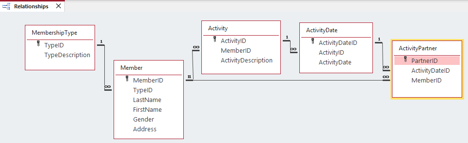 It looks like it's free to become a member as I do not see any dues or fees of any kind in your original example. Mind telling us what kind of membership this is? I see the activities table explains more what the members do. So it's sports/games. My question is how does one become a member? Is there a signup sheet that folks just put their info on, or they request it via email? I assume there are no dues of any kind for this type of membership. So the whole partner thing is based on the type of game being played. Are you tracking scores of the games as well?