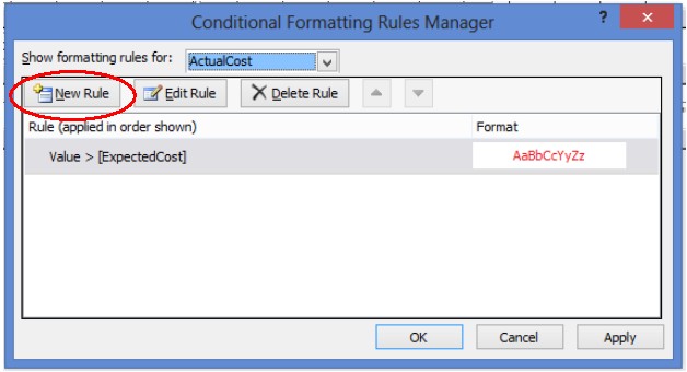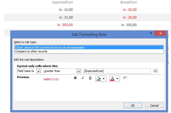 I have tried using all of the help guides provided by Microsoft and several other guides I found online; however conditional formatting is simply not working. I have two fields on a report, the report is based on a query, and the two fields are called "ExpectedCost" and "ActualCost". I want "ActualCost" to turn red if and when it is greater than "ExpectedCost". I clicked on "ActualCost" and then clicked on "Conditional Formatting". I selected "Expression" and then put the following expression in the space available: [ActualCost]>[ExpectedCost]