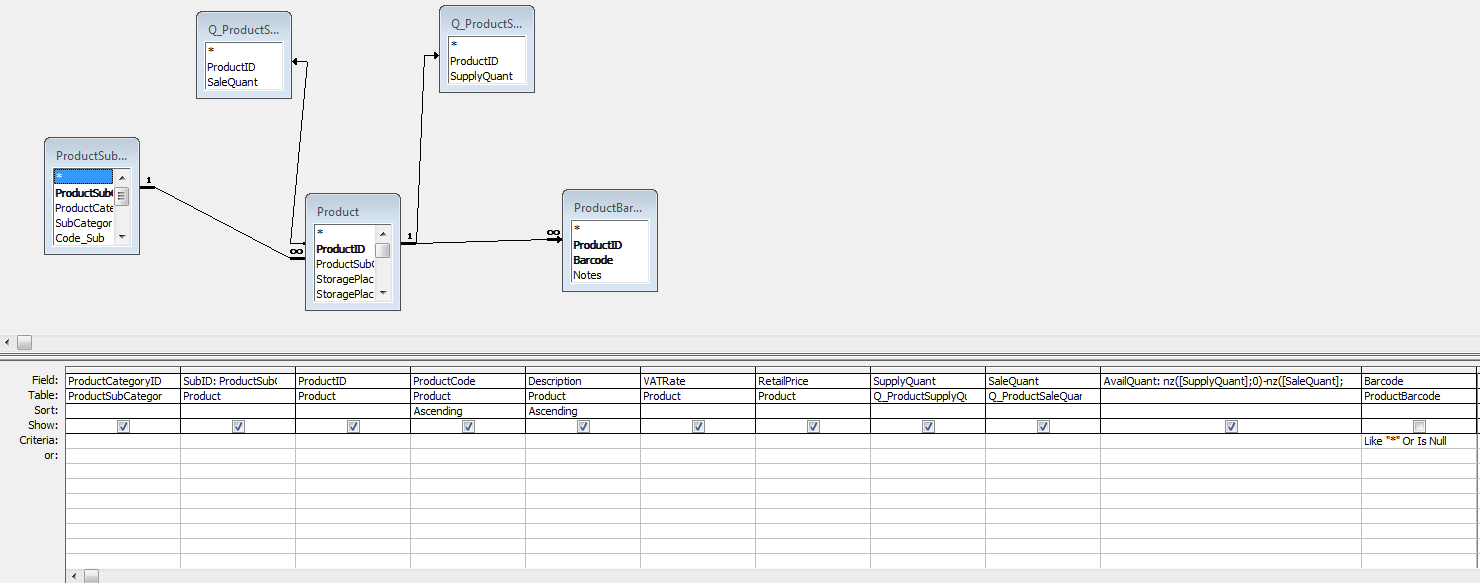 SELECT DISTINCT ProductSubCategory.ProductCategoryID, Product.ProductSubCategoryID AS SubID, Product.ProductID, Product.ProductCode, Product.Description, Product.VATRate, Product.RetailPrice, Q_ProductSupplyQuant.SupplyQuant, Q_ProductSaleQuant.SaleQuant, nz([SupplyQuant],0)-nz([SaleQuant],0) AS AvailQuant