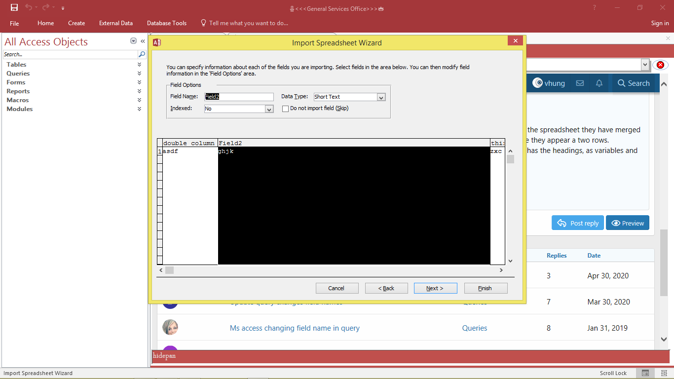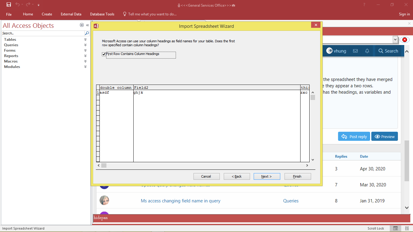 I am importing an excel spreadsheet into a table. The issue is that in the first 2 rows of the spreadsheet they have merged some columns and rows so I cannot use them as headings. However in the access table they appear a two rows.