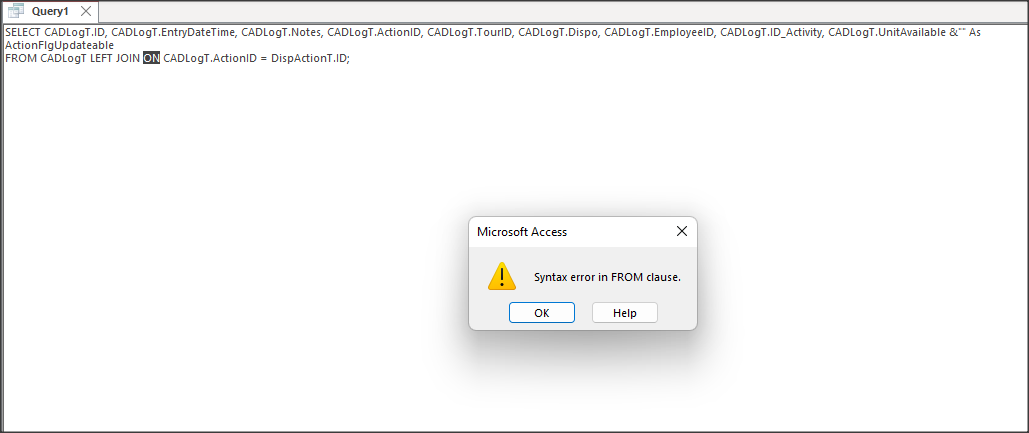 Doc, that worked when I ran it from the Query design window, however, when I used it as the Record Source for CAD_Log_DispF, it got stuck on Case 1 in the case ladder.The correct form of a joining FROM clause is