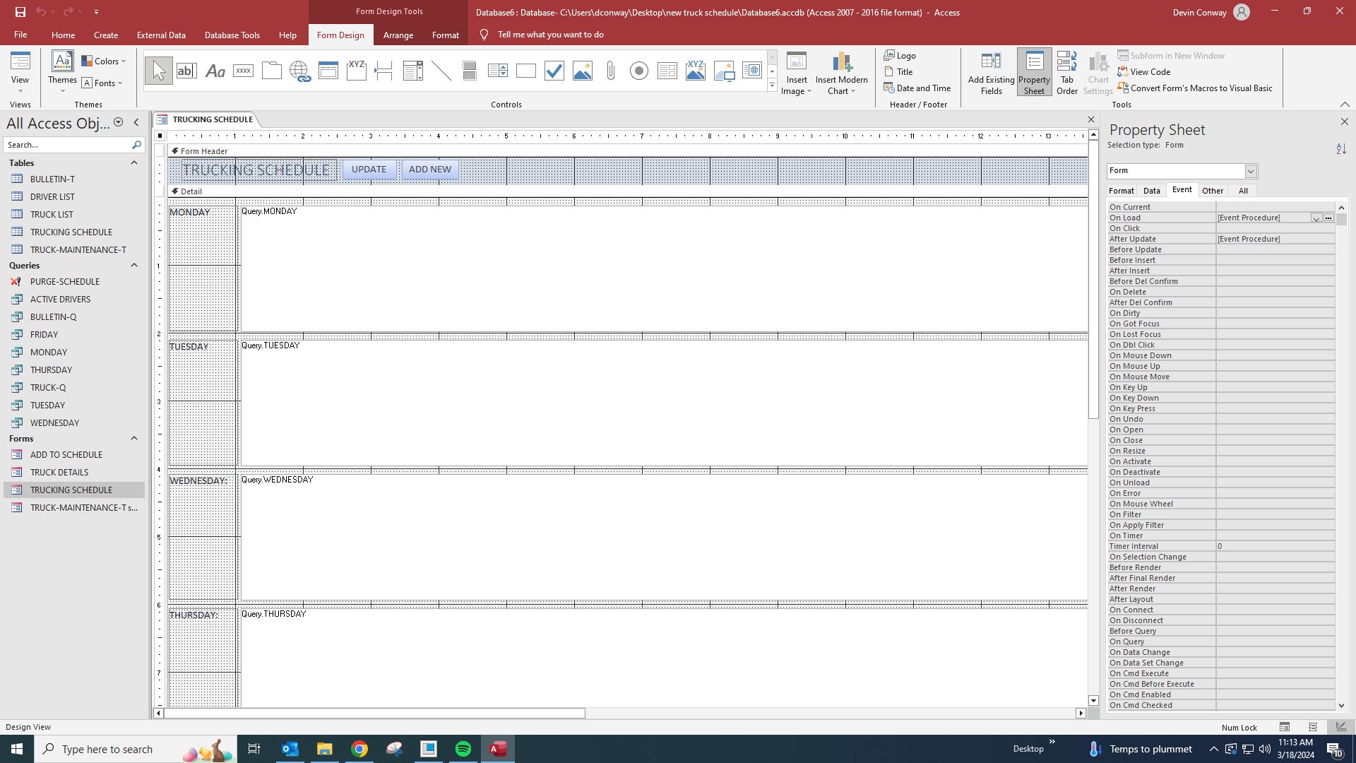 Yes I had load event to auto maximize the main form. I removed that and your code worked. But If I wanted to convert what you have to an if and statement based on todays date that the Monday subform would be white unless today was actually Monday and the same scenario for all other weekdays would I still have this "ambiguous" issue? Or is there a way around it?