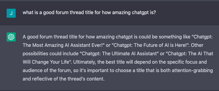 To give a taster for how good it is, I am pasting my question to it and its answer. It wrote this thread title!!