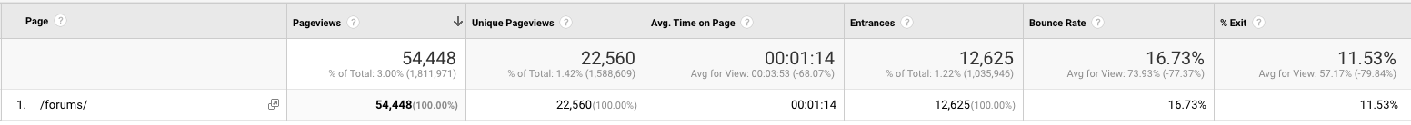I've found that different types of pages can get very different bounce rates. Take a look at the forum index page, for example: