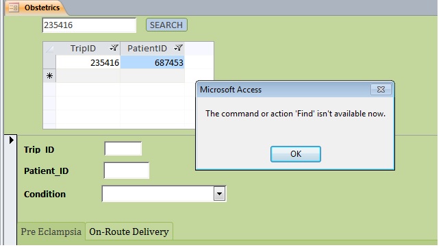 In the attached dbase, the SEARCH button is not working. I also attached a copy of the error message.