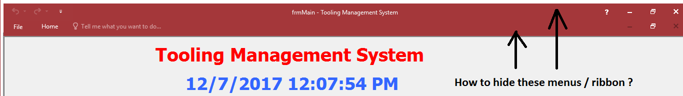 ashleedawg "Here for a good time" Local time Today, 10:08 Joined Jun 22, 2017 Messages 154 Jul 12, 2017 #2 The ribbon's not showing in that picture, I think you mean the menu bar and title bar? This might help: https://access-programmers.co.uk//forums/showthread.php?t=293584 Also: DoCmd.ShowToolbar "Menu Bar", acToolbarNo Last edited: Jul 12, 2017