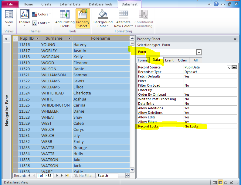 I've gone to the datasheet Design view where there's alot of properties but don't see anything referring to Record locks.