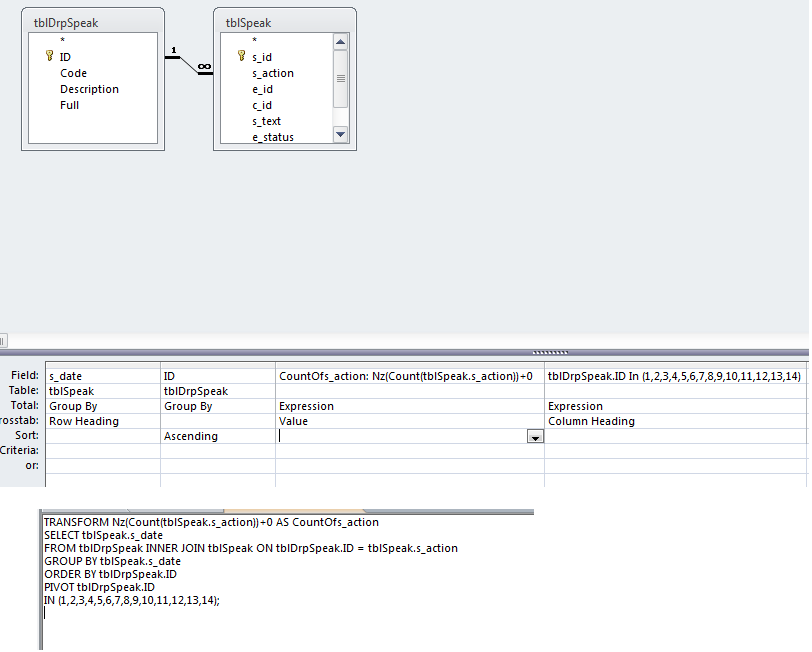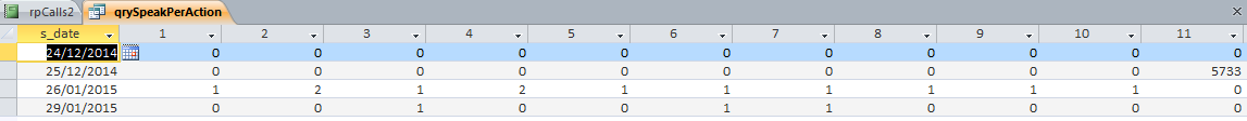 I now want to include the qryMeetingsBookedPerDay (counts m_date_raised and groups by m_date_raised...eg 2 on 24/12/14, 4 on 28/12/14 etc etc) with the qrySpeakGroupedAction...