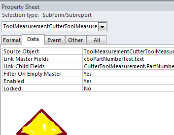 This is able to look up my part number in the toolMeasurement form and display it in the ToolMeasurementCutterToolMeasurement Subformsubform below.