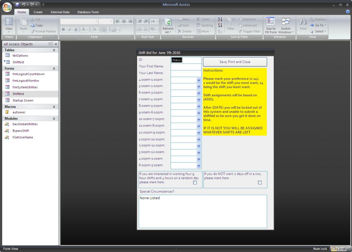 I am trying to limit what my users can choose when filling out a shift bid. This is a VERY simple database and will be tossed when the bid is over.