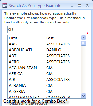 A Access 2007 Combobox has a thousand legal names in many different formats (company, partnerships, dba, individuals ...) in one field. Users asked to see a partial list by typing three or more characters.