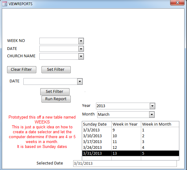 It will open with a list box for the Sundays. The list box will change based on the controls. The dates with the weeks 1..5 will display. Choose one - to automatically fill in a text box.