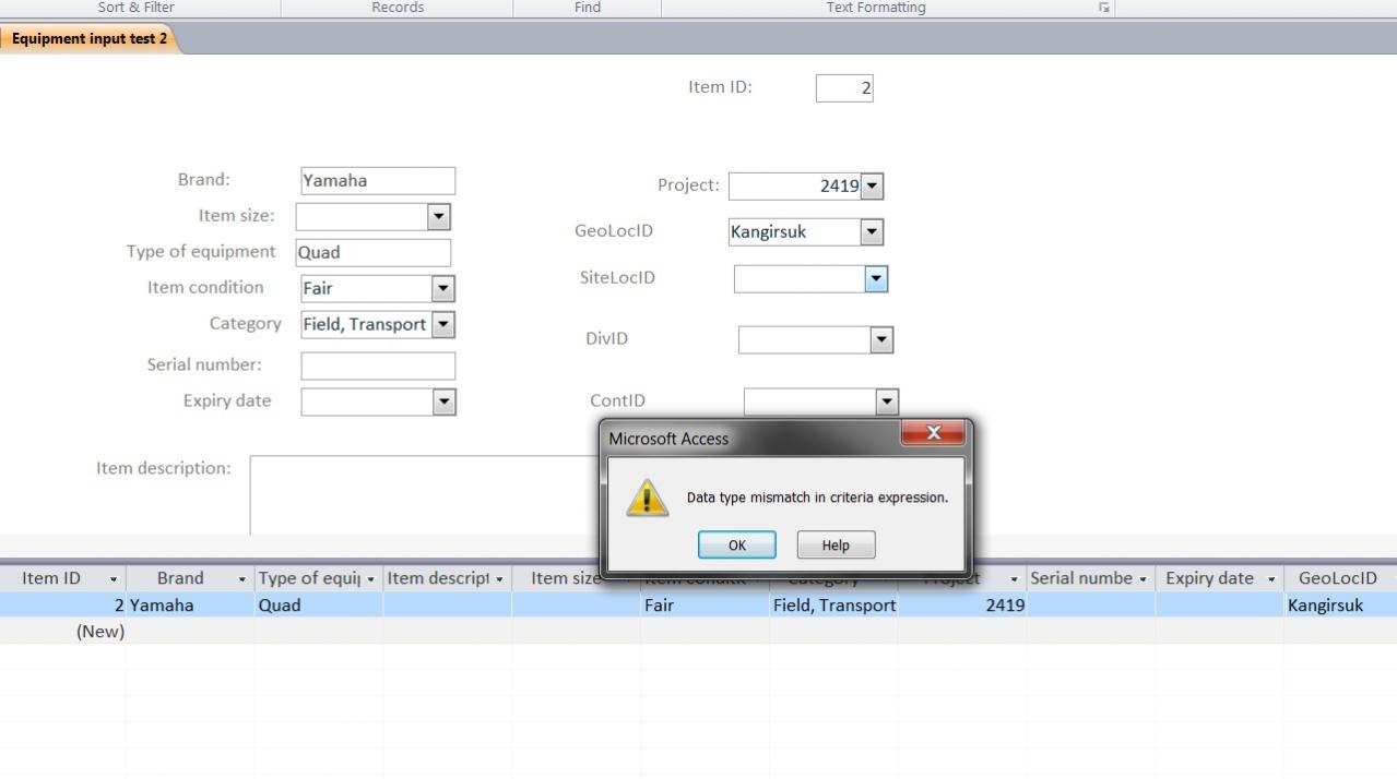 Lately, I decided to change the structure of my database, starting from scratch again, using plenty of related tables instead of everything in a few tables. Now I used the same method for cascading combo boxes, but Access pops an error message when I try my form. Since I have ID numbers instead of the actual data in the source table of my comboboxes, I suspected that my problem could be there, but couldn't find a hint on how to fix it yet. See attachments for screenshots.