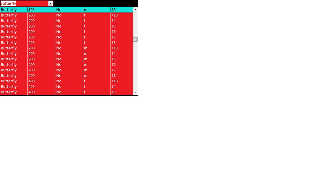 I want this to be split into multiple comboboxes. E.g.the first would list the strokes, the second would show the distance, the third would show the gender etc. This combo box is based on this table (see attachment "table")