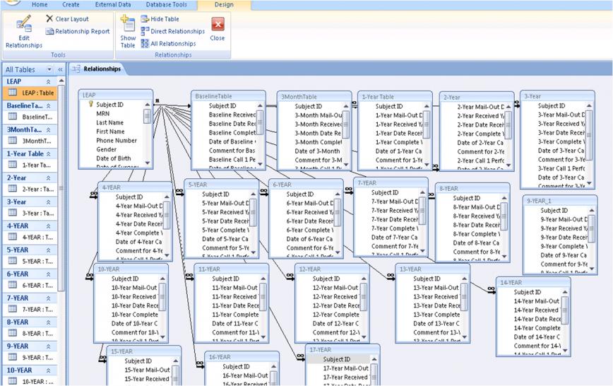 I only have a little experience with Access and am developing a new database for a summer project for a hospital There are 5000 patients in the database. They all get a questionnaire every year. So I made one table with some key pieces of information about the patients, and then I made separate tables for each year they receive their questionnaire. The years only have subject id as the information connecting the the main table. I attached a screenshot of the relationships window.
