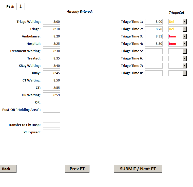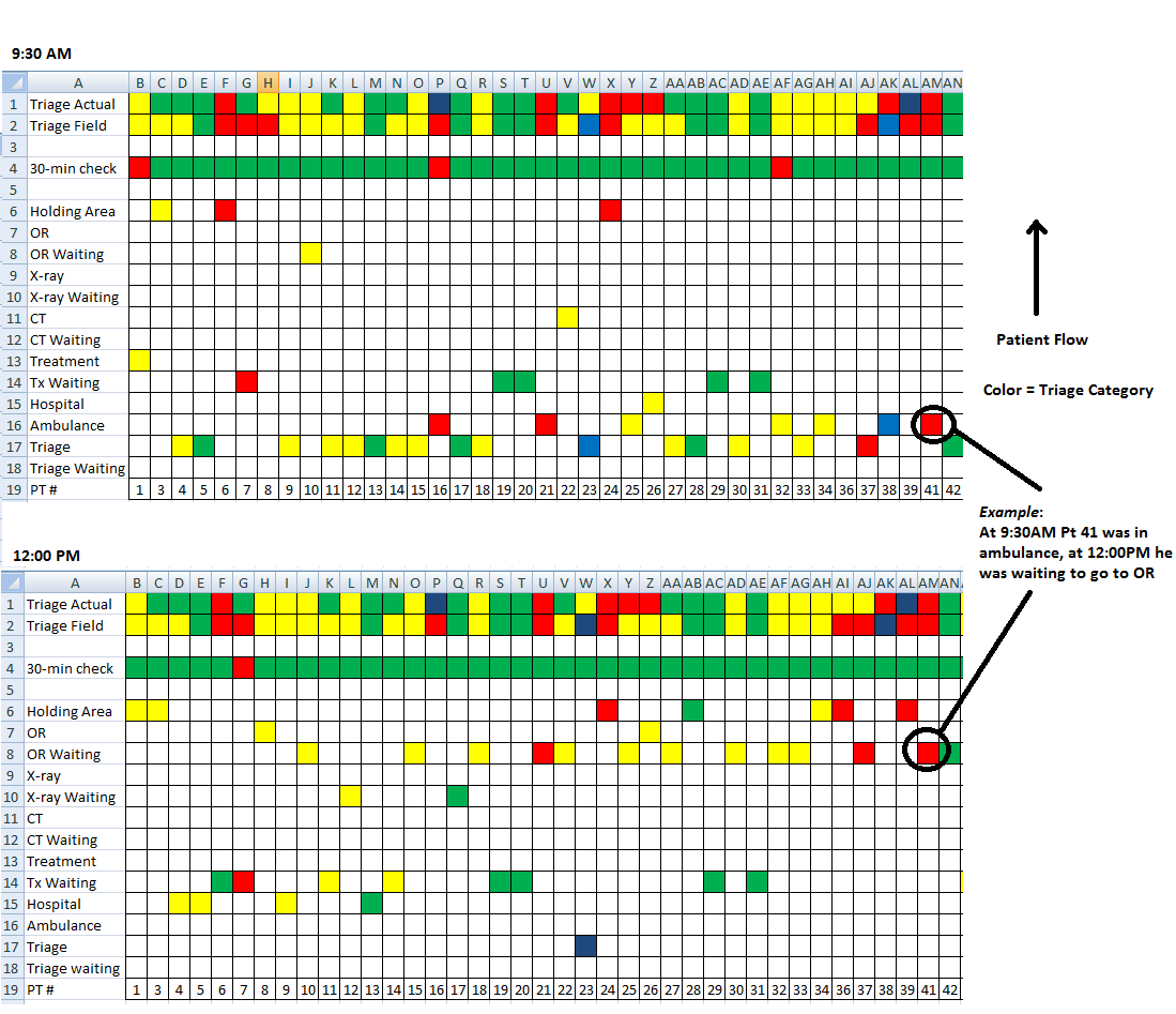 In short he's wanting a color-coded depiction of where patients are by injury severity - think of a little flipbook with pictures so when you flip it you get a little animation. Each time snapshot shows where patients are (so you want the "red" patients to move faster than the yellow/green ones).