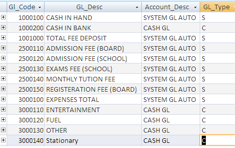 where against GL_code a description field is also there that lookup values from tbl_accounts. dlookup is working fine. but here i want that before dlookup function take a action. it will check GL_type in accounts tbl that either th GL_code is "S" type or "C" if the GL code type is S then msg box will apear that " not allowed" and dlookup stop and exit. if GL type is C then dlookup works. i have also attached screen shot of my tbl_accounts and Vb code is:
