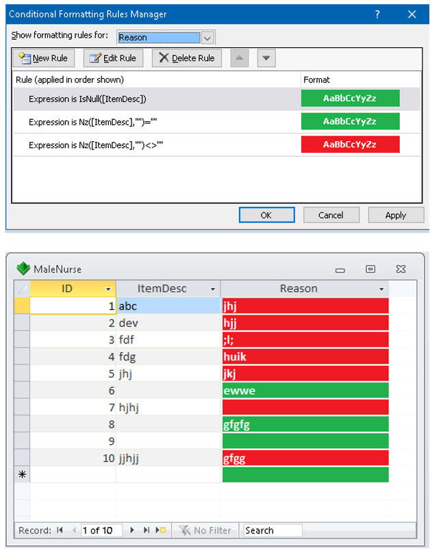 If the field [ItemDesc] is null then I want the formatting of the field [Reason] to be green. If it is not Null I'd like it to be red.