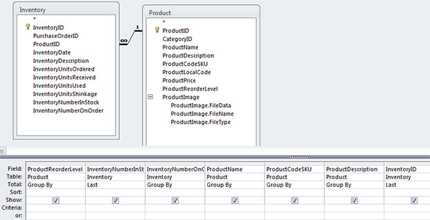 What I have is a query made up of two tables, one product the other inventory. (see below)