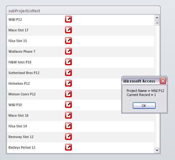 However, when the button is clicked, it always filters by the first record only! I've put a messagebox in the button click event to display the content of the ProjectName field and it always shows the content of the first record, whichever record button you click on.