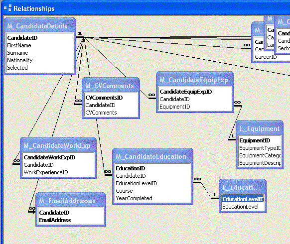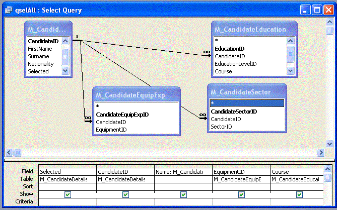 Basically I am building a HR database. The main table is M_CandidateDetails and the primary key is CandidateID. This is a foreign key in all of the other tables: MCandidateEducation, MCandidateEquipExp, MCandidateSector. (I've attached a screenshot of the relationships.)