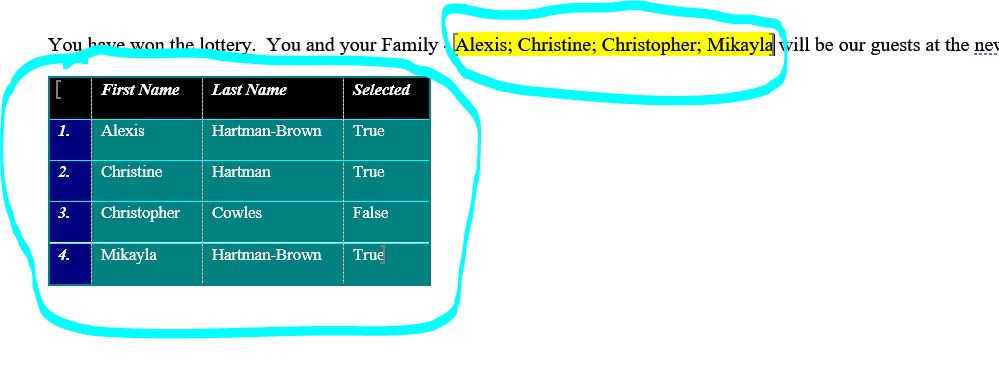 Got a question. I am working back from the Word doc to the ACCESS data, so first I want to make sure I understand creating bookmarks. I have a test document that has the following: