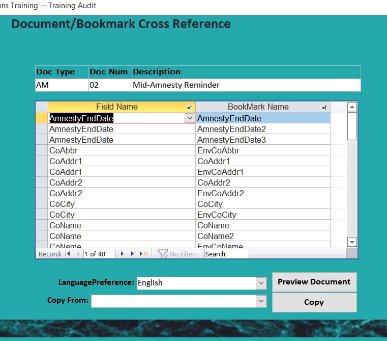 I've posted pictures of the complex solution multiple times. But here is a picture of the form where you define a new Document and then map fields to bookmarks. For the sake of sanity, I use the fieldname as the bookmark name but sometimes, you need to use the same field in a document multiple times. Notice that AmnestyEndDate is used three times and so has three bookmarks. Bookmark names in a document MUST be unique so I use a numeric suffix.